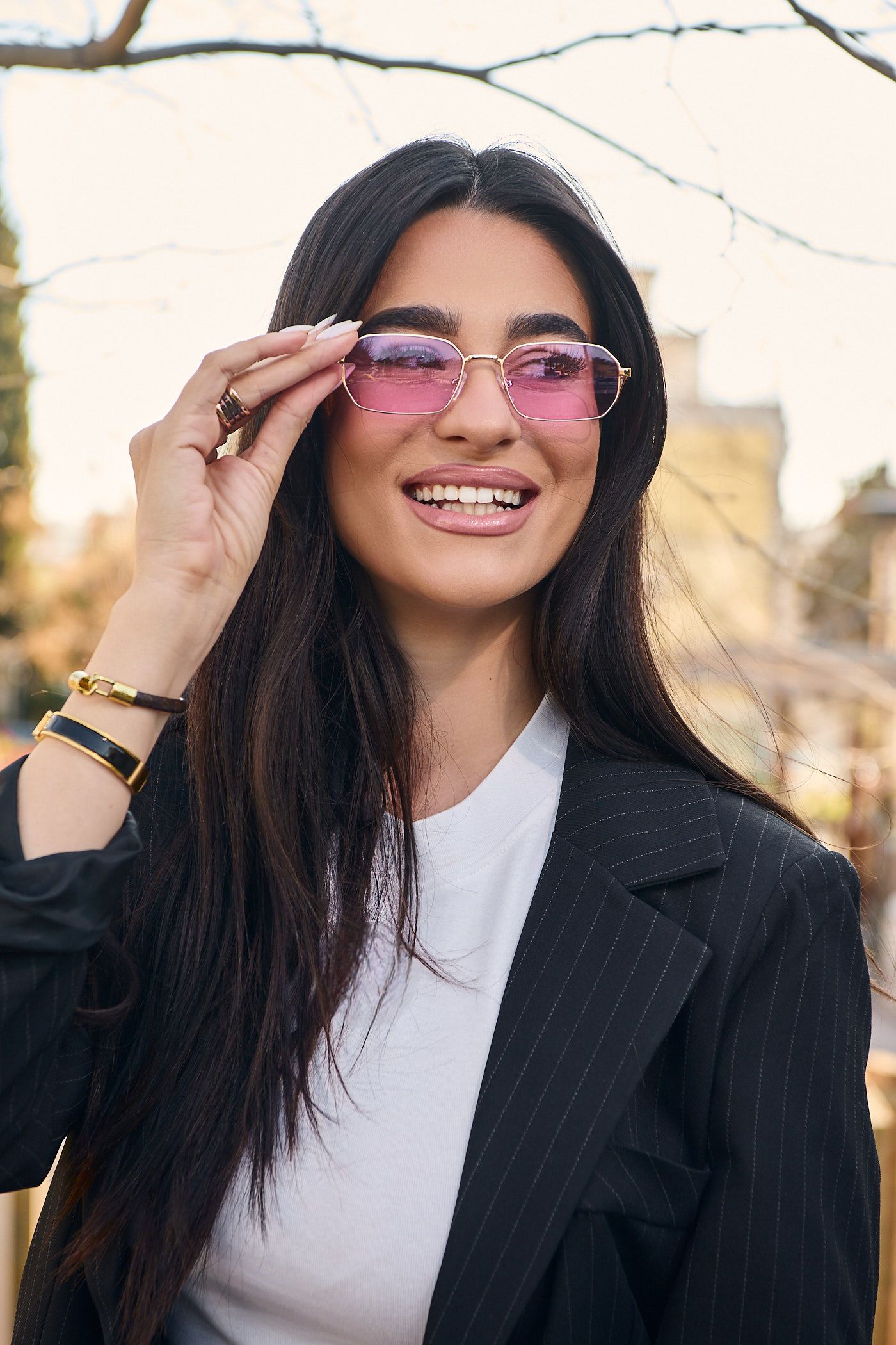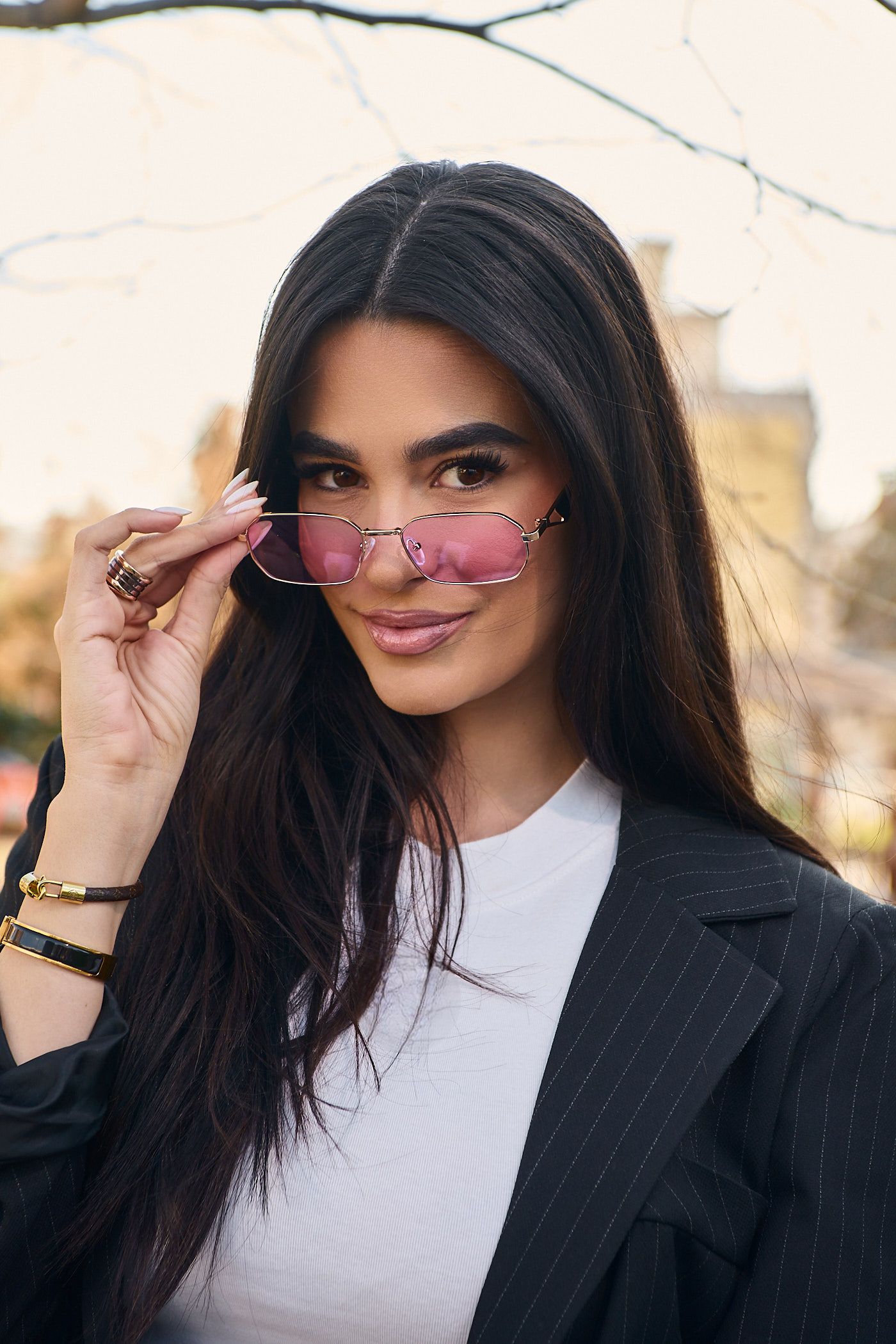 Γυαλιά ηλίου υψηλής ποιότητας με Χρυσό Μεταλλικό σκελετό με μοντέρνο design, ροζ φακό και UV400 προστασία.