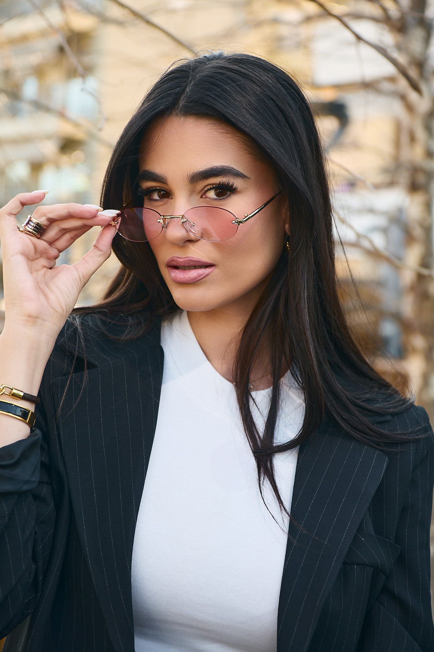 Γυαλιά ηλίου υψηλής ποιότητας με Χρυσό Μεταλλικό σκελετό με μοντέρνο design, ροζ φακό και UV400 προστασία.
