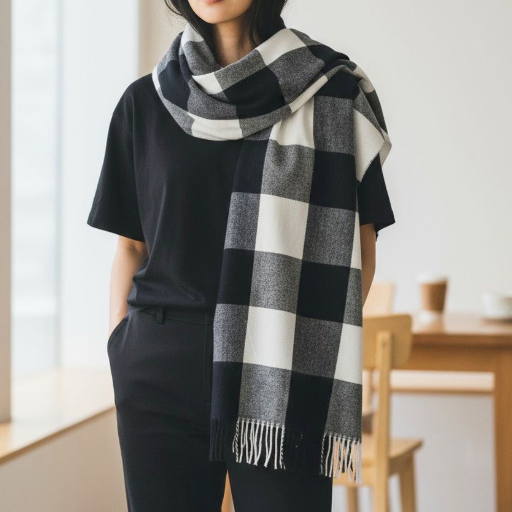 Γυναικεία Πασμίνα Μακριά με Κρόσσια Καρό Alina – Ασπρόμαυρη