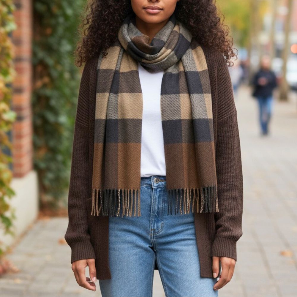 Γυναικεία Πασμίνα Μακριά με Κρόσσια Καρό – Καφέ