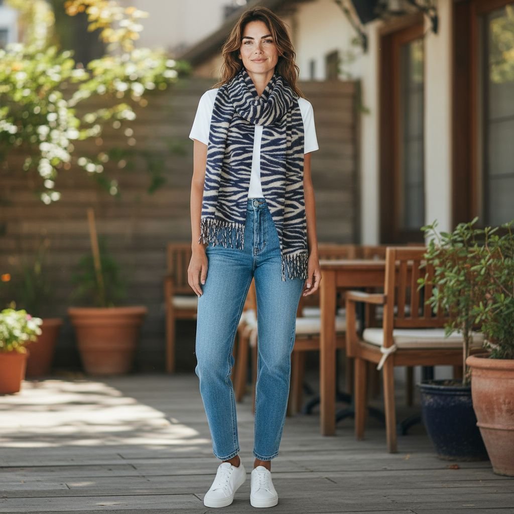 Γυναικεία Πασμίνα Μακριά με Κρόσσια Ζεβρέ – Μπλε