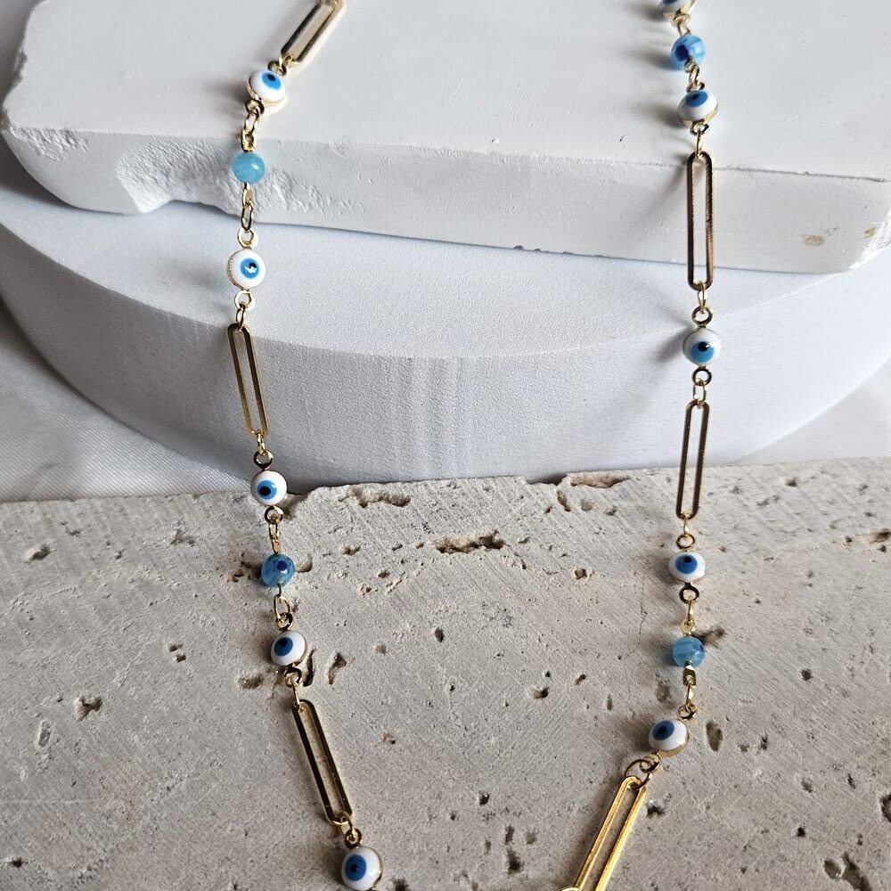 Κολιέ με Ματάκια, Γαλάζιες Πέτρες και Αλυσίδα Πλακέ- Χρυσό
