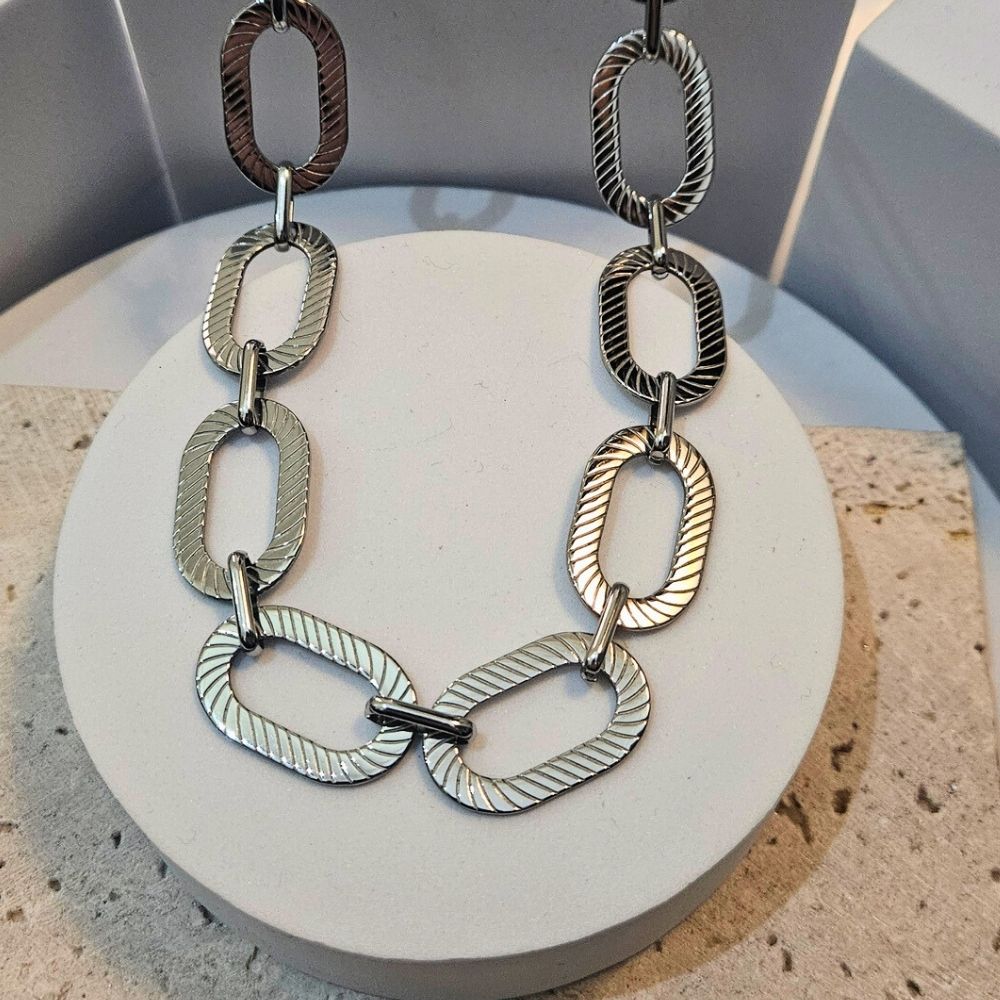 Κολιέ Αλυσίδα με Οβάλ Ραβδωτούς Κρίκους – Ασημί
