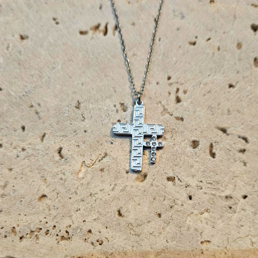 Κολιέ Διπλός Σταυρός με Σχέδιο Μαίανδρος – Ασημί