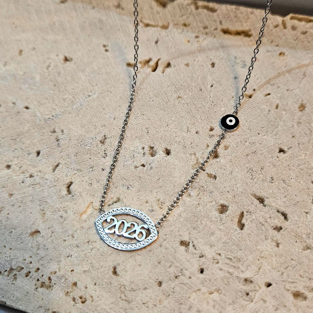 Κολιέ Γούρι 2026 Οβάλ με Στρας και Ματάκι στην Αλυσίδα – Ασημί