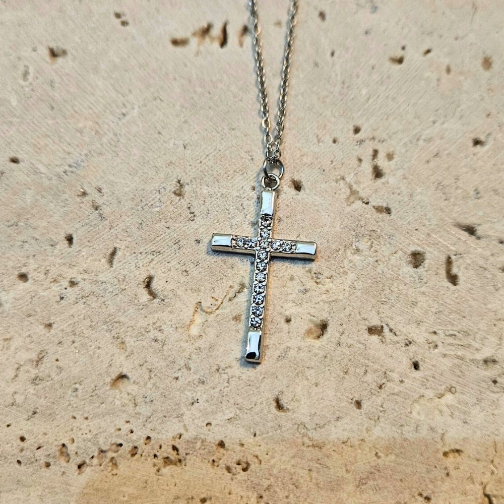Κολιέ Λεπτός Σταυρός με Στρας – Ασημί