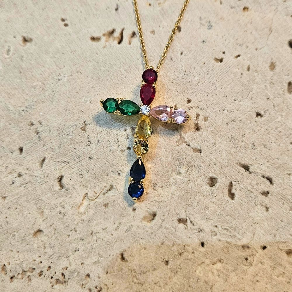 Κολιέ Σταυρός με Χρωματιστά Κρύσταλλα – Χρυσό