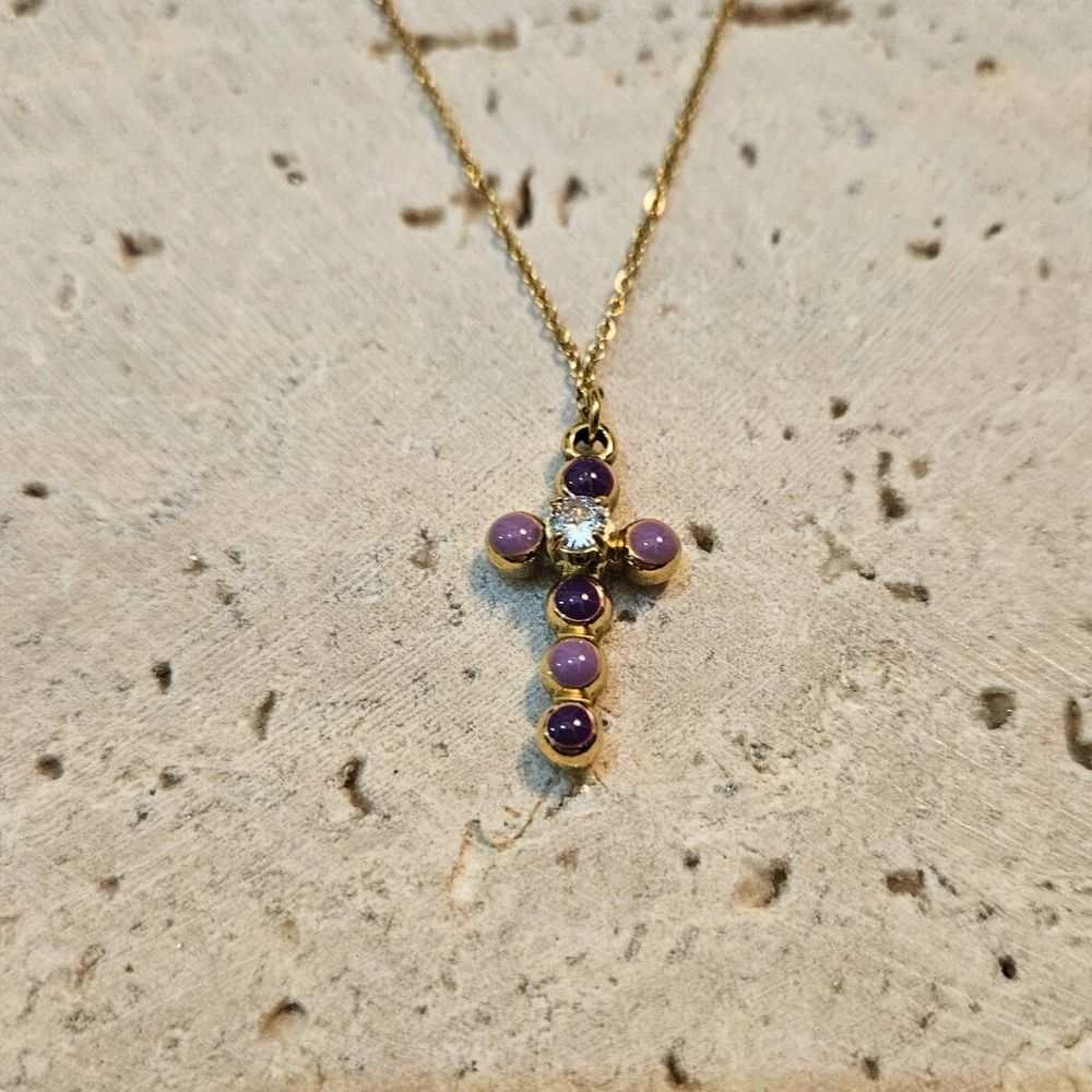 Κολιέ Σταυρός με Μωβ Χάντρες και Ζιργκόν – Χρυσό