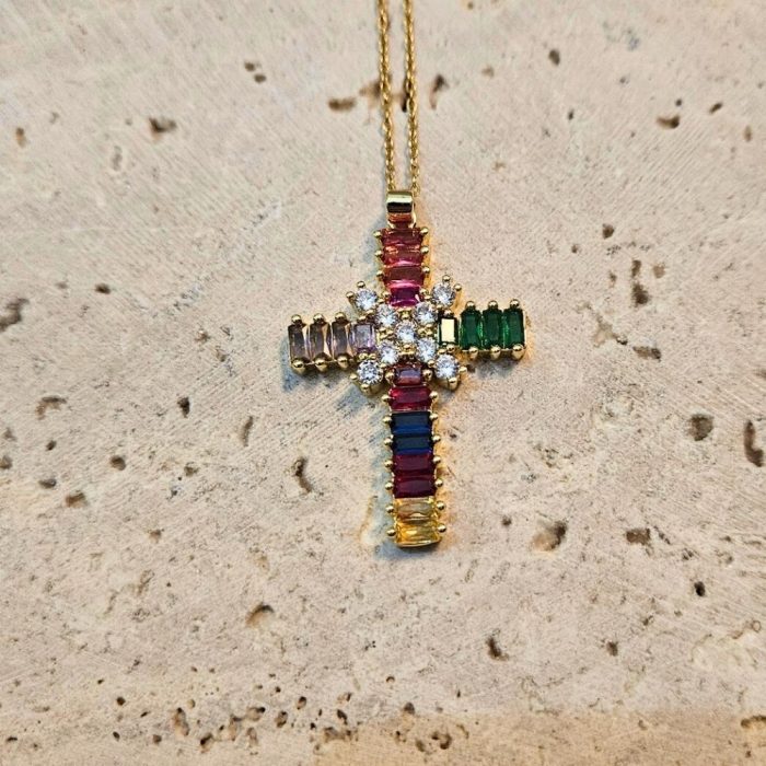 Κολιέ Σταυρός με Πολύχρωμες Πέτρες – Χρυσό