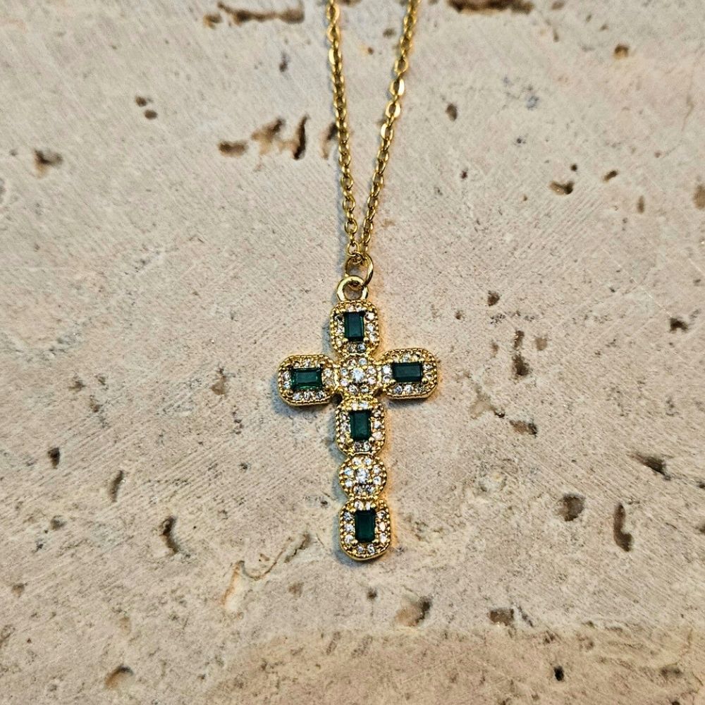 Κολιέ Σταυρός με Πράσινα Κρύσταλλα – Χρυσό