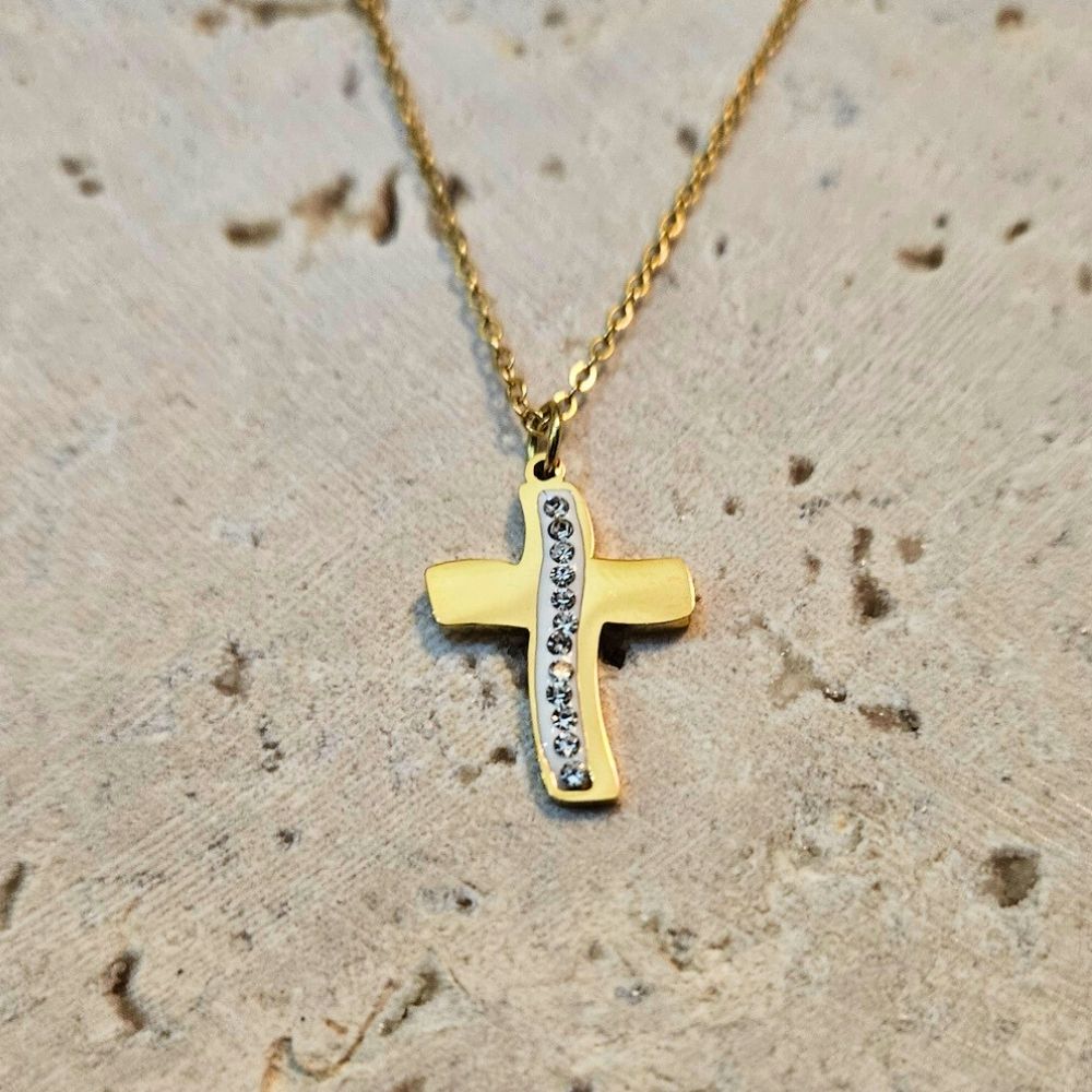 Κολιέ Σταυρός Καμπυλωτός με Στρας – Χρυσό