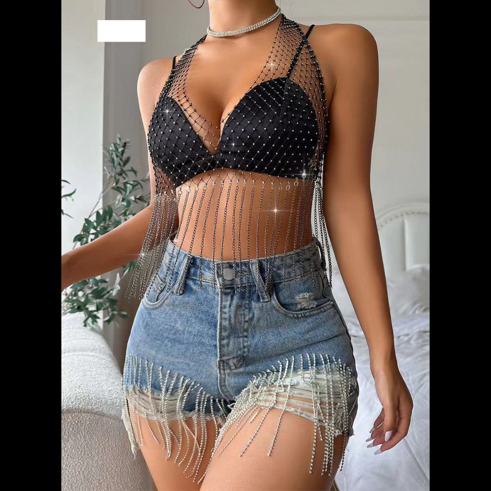 Top με Μακριά Κρόσσια και Στρας – Μαύρο