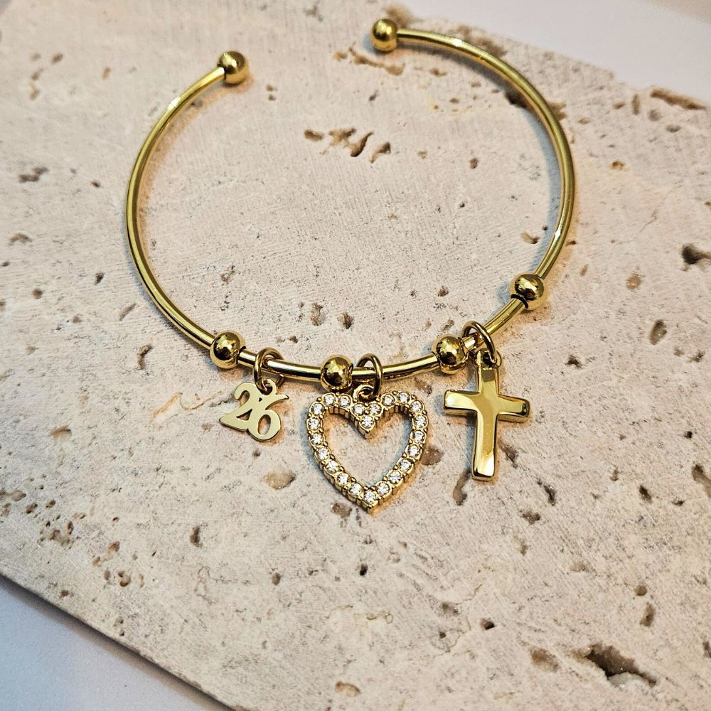 Βραχιόλι Γούρι 2026 Open Σταυρουδάκι και Καρδιά με Στρας – Χρυσό
