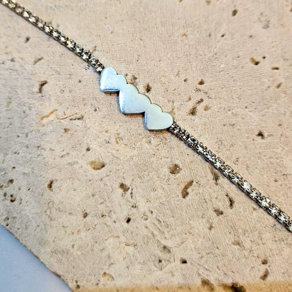 Βραχιόλι με Δυνατότητα Χάραξης Triple Hearts με Στρας – Ασημί