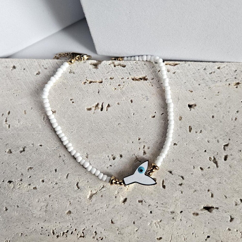 Βραχιόλι Ποδιού Με Λευκές Χάντρες και Ουρά Δελφινιού με Ματάκι - Ασημί Original price was: 15,90 €.Η τρέχουσα τιμή είναι: 7,90 €. με φπα